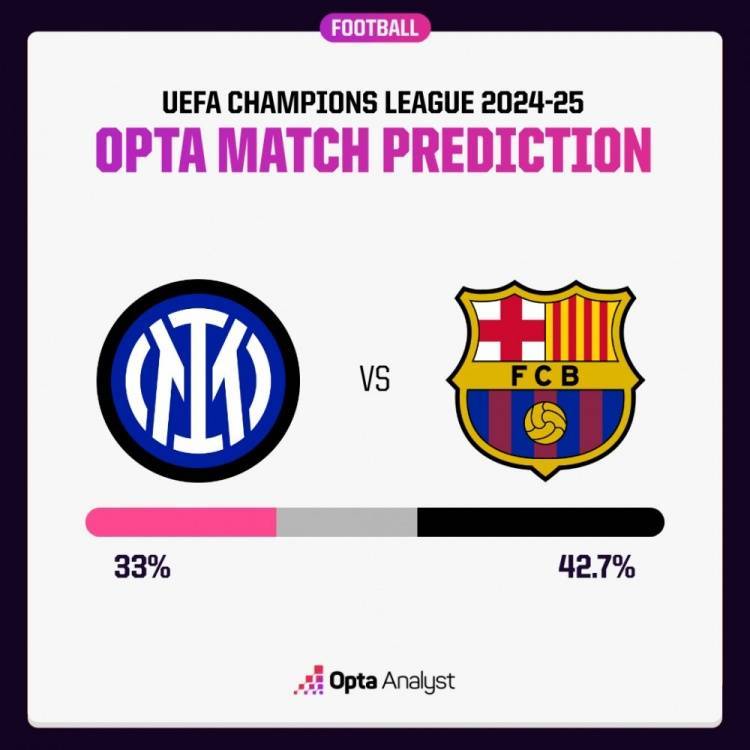 Opta超级计算机对国米强势的欧战主场纪录并不“感冒”,认为巴萨更有可能在次回合赢球(概率为42.7%)。国际米兰赢球的概率为33%,而打平的概率为24.3%。